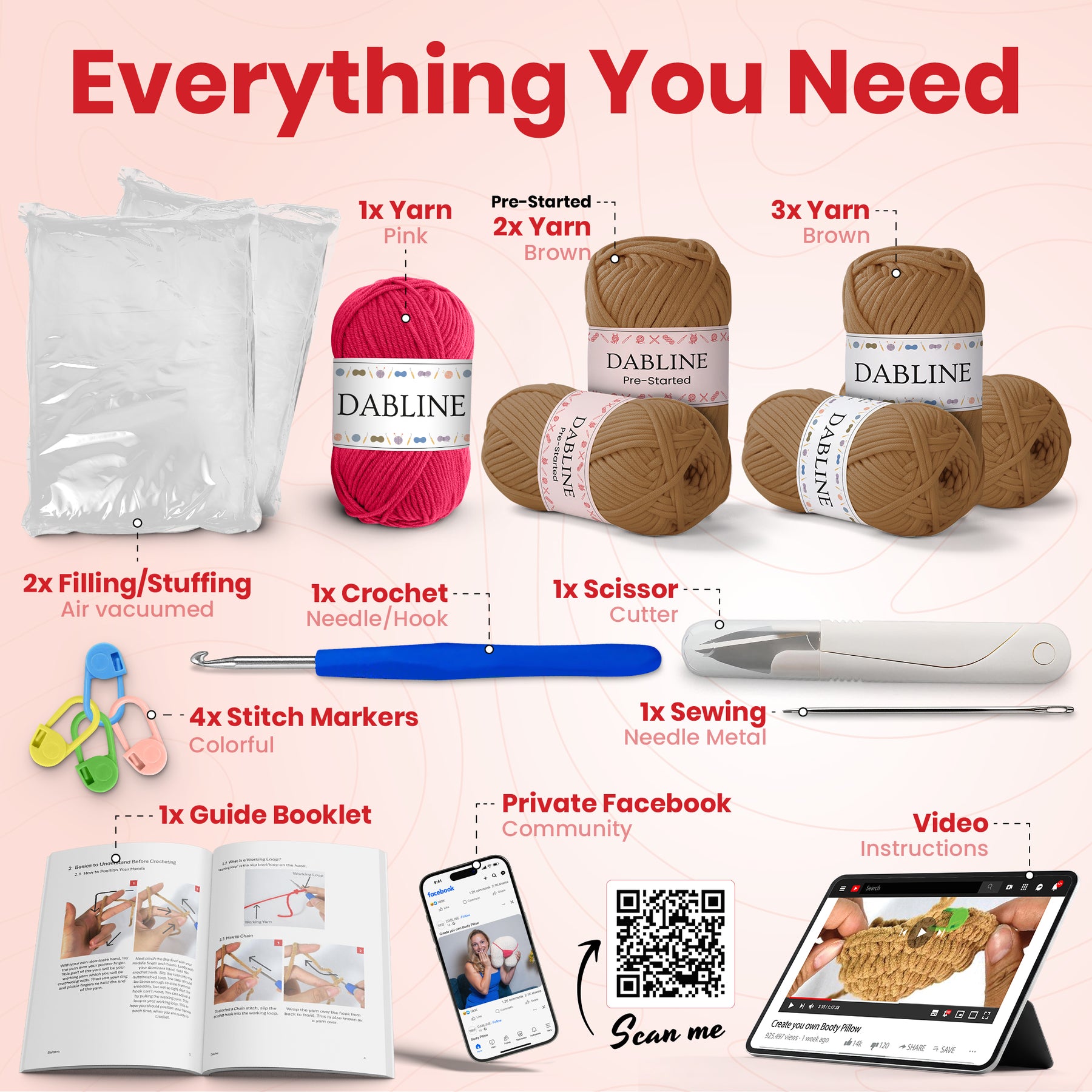 • COMPLETE CROCHET KIT FOR BEGINNERS: Your fun kit comes with everything you need to create your very first booty pillow. You will get a pre-started yarn, ample soft cotton stuffing, a 4mm crochet hook, scissors, stitch markers, a sewing needle, and a written instruction booklet. Just open the box and start crocheting with confidence.