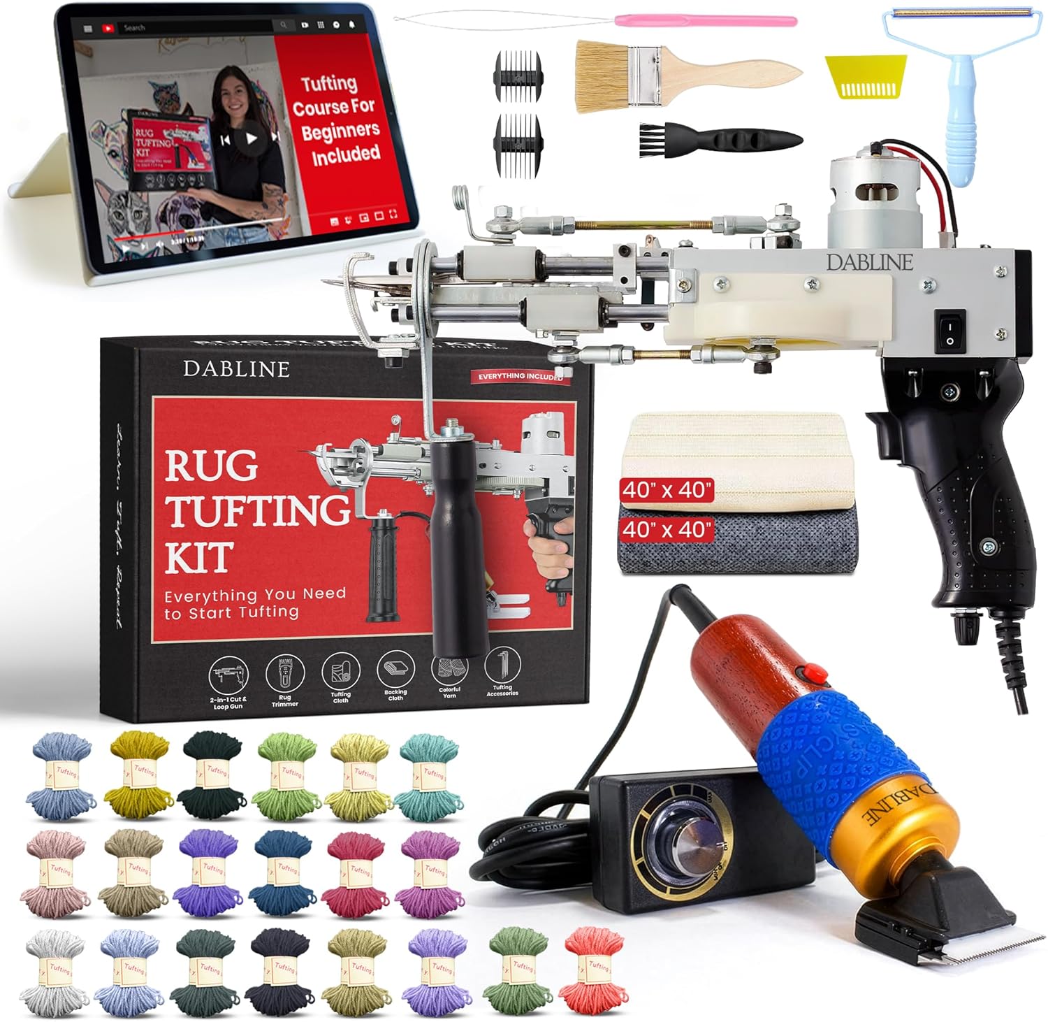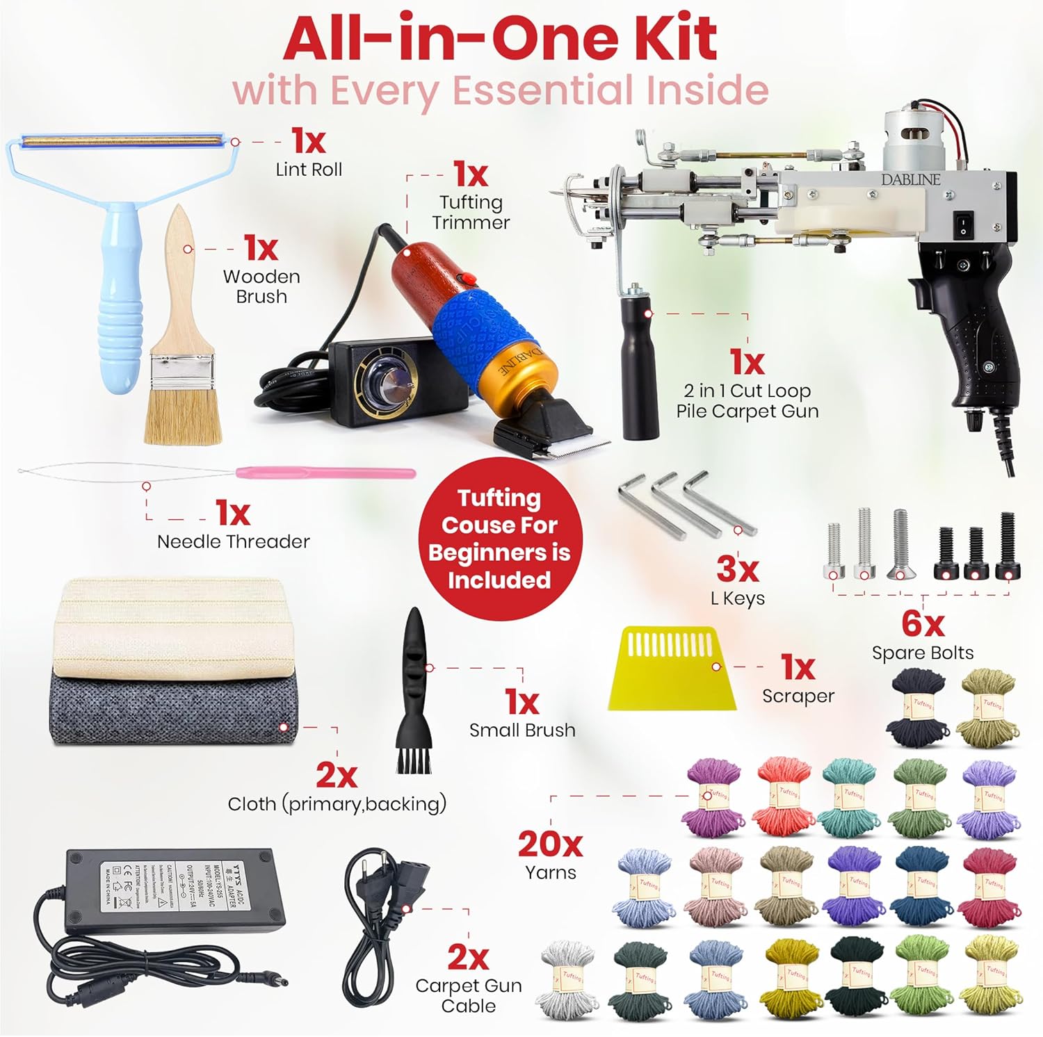 ALL IN ONE STARTER KIT: Your complete rug tufting kit includes a full beginners course, 2-in-1 cut & loop pile tufting gun, carpet trimmer, tufting cloth, backing cloth, 20 skeins of colorful yarn, lint roller, spare bolts, scraper, cleaning brush, L-keys, needle threader, and yarn threader, and all the tools you need to start tufting right away.