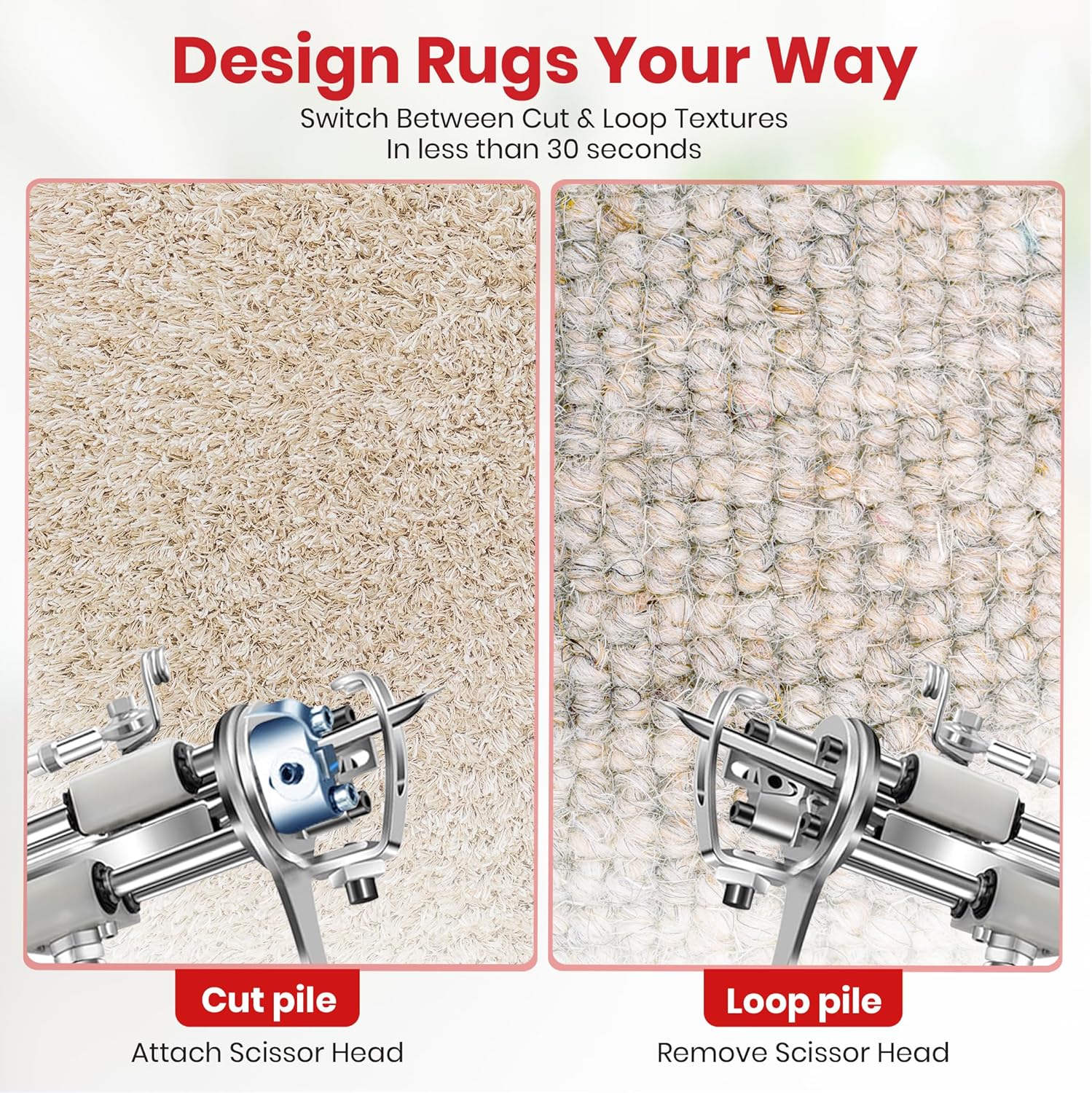 DESIGN RUGS YOUR WAY: Switch seamlessly between cut pile and loop pile modes with a single machine. Designed for precision rug making, your electric rug gun ensures smooth operation and control for consistent stitch quality.