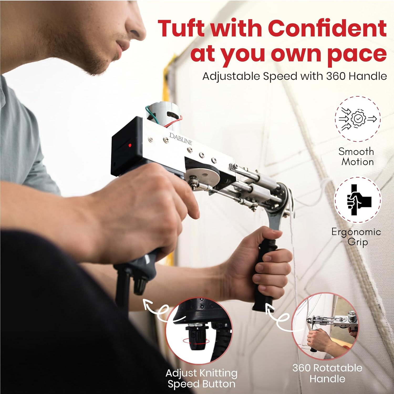 CONTROL YOUR PACE FOR EVERY PROJECT: With adjustable control and a 360° rotatable handle, you can tuft comfortably at any angle. Enjoy total control as you work, explore dual textures, and create rugs that match your unique vision.